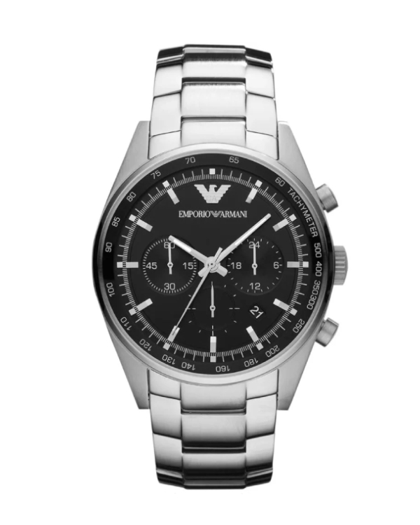 EMPORIO ARMANI Classic Silver Stainless Steel Chronograph Quartz Watch with Black Dial for Men – AR0389